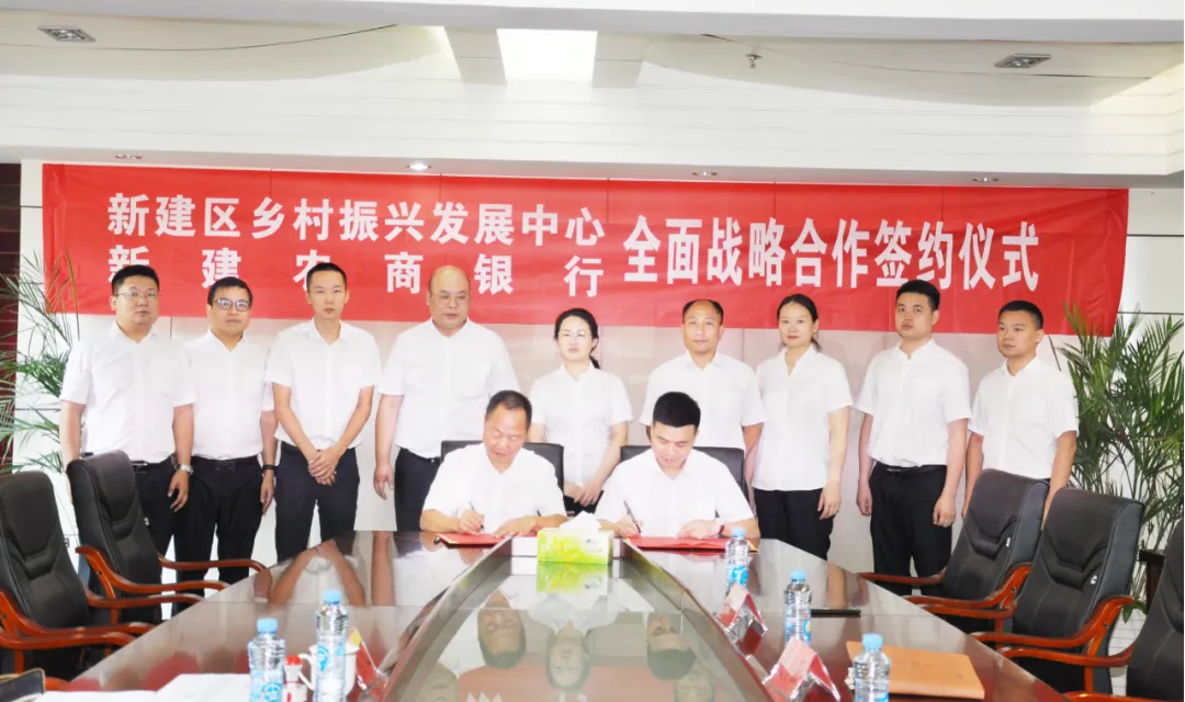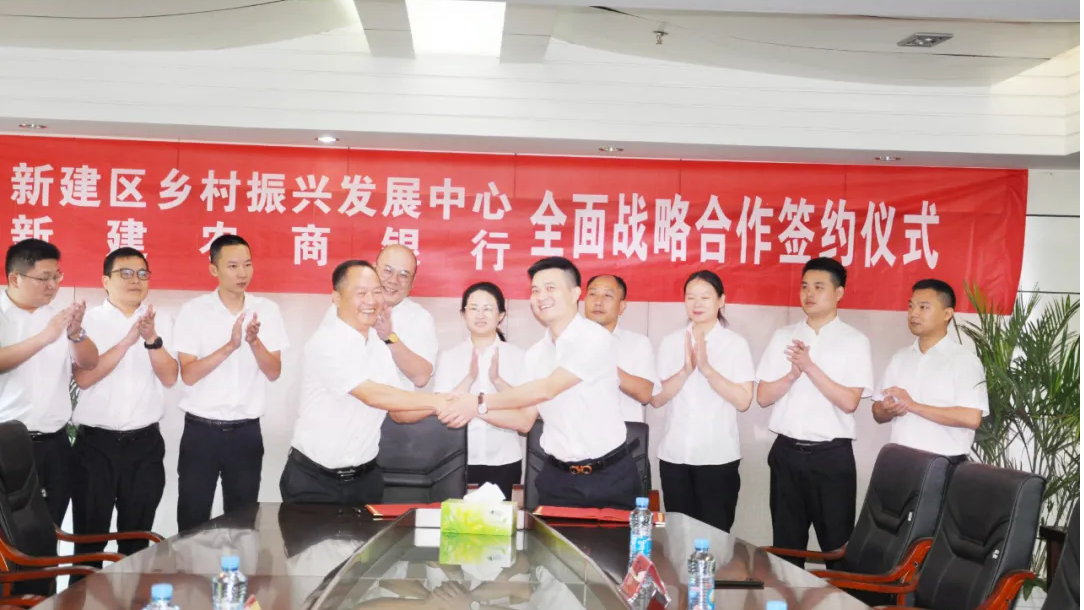 为建立全面、长期和稳定的合作关系,进一步夯实新建区乡村振兴战略基础,9月14日,新建区乡村振兴发展中心与新建农商银行签署了“乡村振兴”全面战略合作协议。新建区乡村振兴发展中心主任杨峰与新建农商银行党委书记、董事长闵艳群共同出席签约仪式,区乡村振兴发展中心副主任熊文,新建农商银行党委委员、纪委书记、监事长夏小强,新建农商银行党委委员、副行长邓阳阳参加仪式。