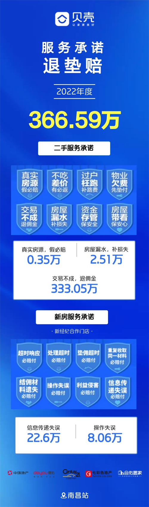 有承诺,只是保障的开始;能履约,才是安心的根本。2022年贝壳南昌站合作的五大新经纪品牌及门店因八大服务承诺向消费者累计退垫赔共196单,335.93万。其中交易不成退佣金履约金额为333.05万,房屋漏水赔付2.51万,真实房源0.35万。交易不成退佣金做到了平均退费时间5天,37%门店做到3日内退费,1日内完成退费门店18家,真正做到交易不成佣金无理由退。贝壳南昌站对合作伙伴也做出了多项服务承诺,如2021年3月份升级了新房八大服务承诺,倒逼内部流程作业规范,保障门店佣金结算。