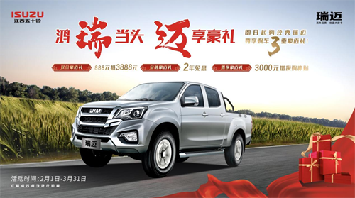 春归万物苏,美好皆可期。无论是外出郊游,还是商务需要,一辆宜家宜商的创富车显得尤为重要。为了回馈广大用户对江西五十铃的支持,让更多用户畅享瑞迈创富之旅,江西五十铃开展鸿“瑞”当头,“迈”享豪礼活动。