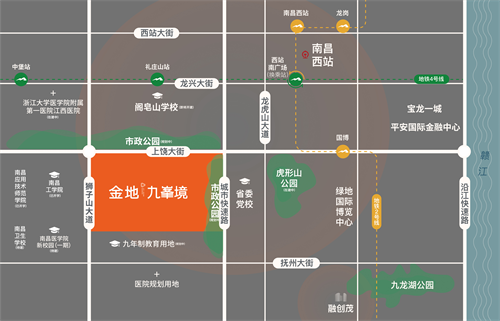 金地集团以前瞻眼光择址西站核芯区,于西站向南2公里处,领悟城市精神,在建筑、文化、精神等层次上达成共鸣,筑就不可多得的城市TOD生活圈。在金地·九峯境3公里生活圈,集西站、地铁4号线礼庄山站&地铁7号线(远期规划)、阁皂山九年制学校(在建)、虎形山公园(规划中)、沃华W广场等城市级配套于一身。这是一个由城市黄金动线、自然风景线、文脉线构筑的国际中芯,已跃然眼前,只待您亲自前往鉴证!