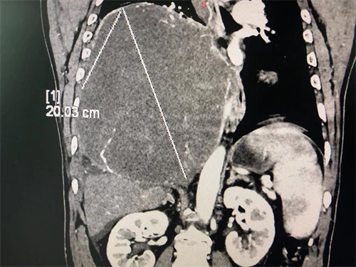 去年8月开始,刘大叔偶有咳嗽和少量白粘痰,稍稍活动就感胸闷不适,当时未引起重视;到了12月,因新冠病毒感染,引发剧烈咳嗽,且核酸结果转阴后咳嗽仍不见好转,身体也逐渐消瘦,前往南昌多家省级三甲医院就诊,行胸部CT提示右侧胸腔有一巨大软组织密影,直径约28厘米,病灶累及右侧膈肌,经皮肺穿刺活检,提示为“孤立性纤维肿瘤”。