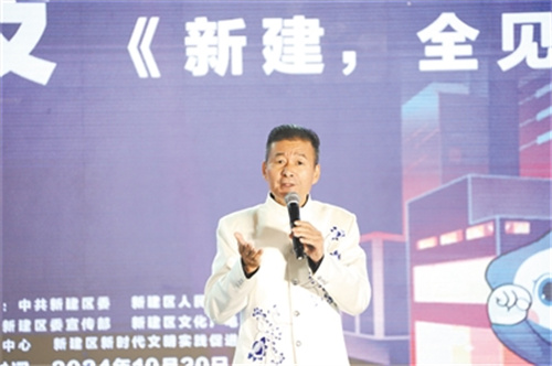 比赛中,选手们纷纷登台亮相,南昌方言金句不断。高康宁的《新建小趣事》和相声《方言漫谈》让观众捧腹大笑,感受到了新建人民的风趣与幽默。豫章鸿也的《南昌话不简单》和趣味方言配音则展示了南昌话的丰富内涵和独特魅力。黄洋的《精神病不传染 精神科不打人》和趣味方言配音更是将现场气氛推向了高潮。随后上场的选手王少波的脱口秀《新建,全见!》成为全场焦点。他用南昌话生动地描绘了新建区的风土人情和历史文化,让观众仿佛置身于这片充满活力的土地。“我们大新建:‘千年古邑’冒有哇,人文底蕴好恰噶!‘鱼米之乡’冒有挡!”伴随着他的热情表白,现场响起了热烈的掌声和欢呼声。除了脱口秀表演外,王少波还带来了一首原创歌曲《新建》。
