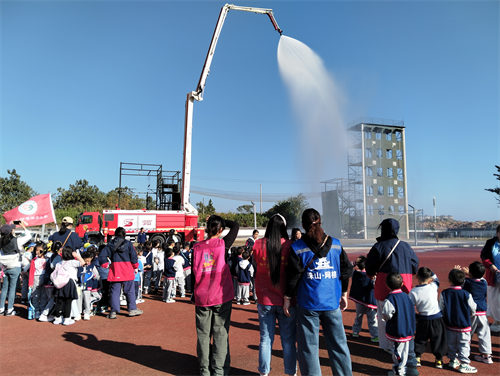 孩子们近距离的触摸高压水枪,观看消防员操作消防车喷水时水枪里的水雾变化成水柱,喷出十几米远。看到高压水枪喷射的那一瞬间,全场沸腾,小朋友们摩拳擦掌。孩子们在寓教于乐中学习消防知识。