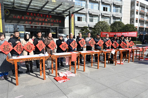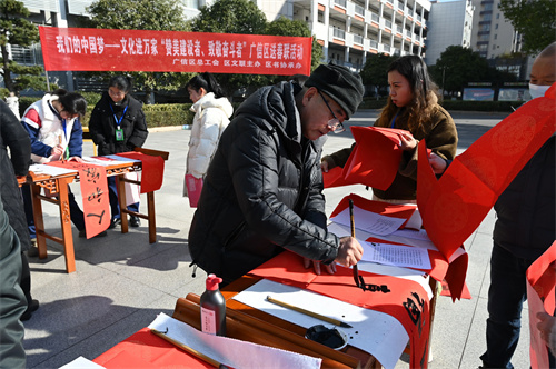 1月13日,我们的中国梦——文化进万家“赞美建设者、致敬奋斗者”送春联活动在上饶市广信区第七中学举办,此次活动由上饶市广信区总工会和广信区文联联合主办。区文联主席徐机华,区总工会党组成员、二级主任科员王振华,区书法家协会长杨坚携7名知名书法家来到七中,与学校美术组老师、学生代表一同为师生们送上一份份传统文化的年味“礼包”。