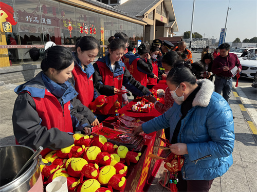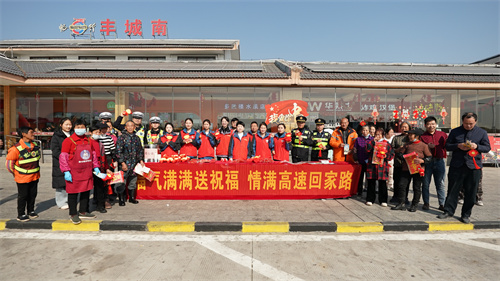 1月16日,江西畅行南昌分公司丰城南服务区联合高速交警、交通运输执法局在开展“福气满满送祝福,情满高速回家路”春运志愿服务活动,为在服务区短暂停留的司乘人员送去温暖与关怀。
