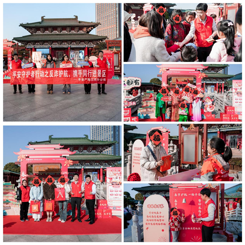 在滕王阁北园,平安产险志愿者们化身平安守护者,深入景区为游客普及金融教育知识,宣讲反欺诈常识。活动现场春节氛围浓厚,设置了金融知识问答、敲响反诈警示钟、免费打印照片等趣味项目,为参与互动的游客发出500余份新春礼品及金融教育宣传折页,极大的提升了保险行业及平安产险服务口碑。