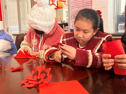 活动现场,志愿者通过讲述一个个有趣的故事,让孩子们了解春节的由来和习俗,加深对春节的认识。在志愿者的指导下,孩子们互帮互助,认真地用手中的剪刀剪出了各式各样的窗花。喜庆的大红色、绚烂缤纷的花朵、俏皮可爱的雪花和福字……一个个创意纷呈的窗花在孩子们灵巧的小手中活灵活现,一幅幅赏心悦目、栩栩如生的剪纸作品饱含着新春祝福,充满了欢乐祥和的新年气息。