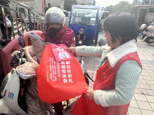活动期间,社区志愿者进入康家花园小区人流量大的区域,向过往居民发放精心制作的宣传单。宣传单上,用通俗易懂的语言和直观的数据,剖析高价彩礼给家庭带来的经济压力,以及对婚姻、社会风气产生的不良影响,同时列举了文明、节俭办婚礼的诸多好处,倡导居民摒弃高价彩礼的陋习。