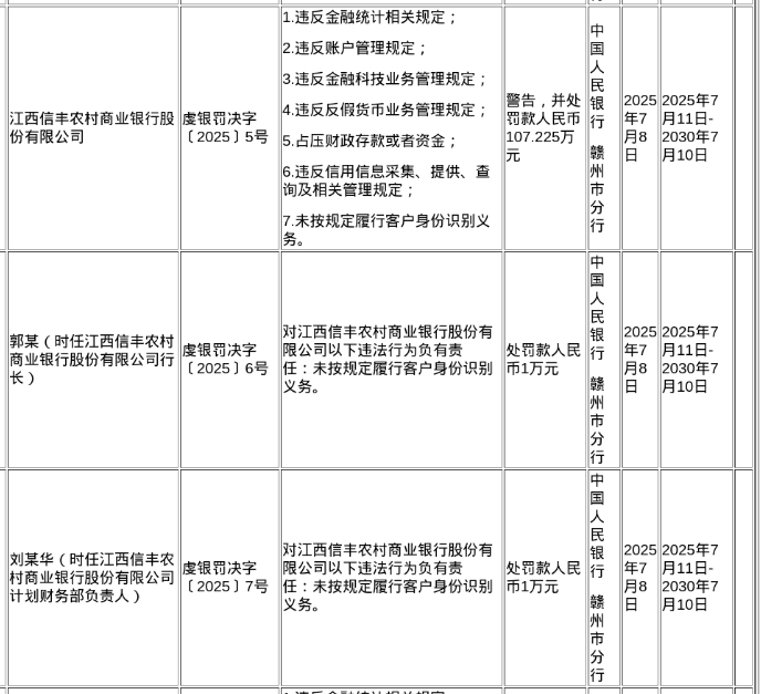 蓝鲸新闻7月12日讯,近日,中国人民银行赣州市分行发布了罚单,剑指江西信丰农村商业银行股份有限公司及其相关责任人。