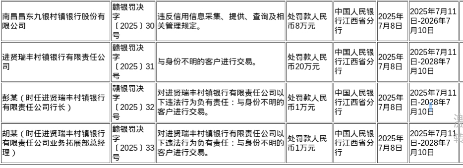 蓝鲸新闻7月12日讯,近日,中国人民银行江西省分行发布了罚单,剑指南昌昌东九银村镇银行股份有限公司、进贤瑞丰村镇银行有限责任公司及其相关责任人。