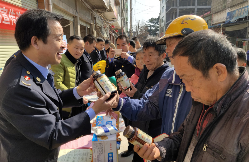 图为该局工作人员现场教群众辨识保健品真伪。