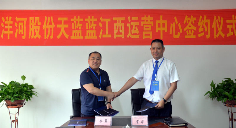 江苏中彩天蓝商贸有限公司总经理朱勇与洋河股份天蓝蓝江西运营中心董事长肖华签约