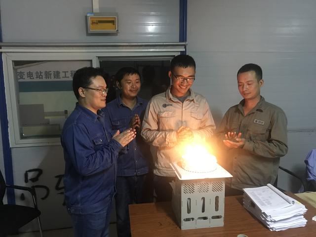 小孟闭上眼睛,对着蛋糕许下心愿:“希望我们都平平安安,希望城东110千伏变电站顺利投运。”