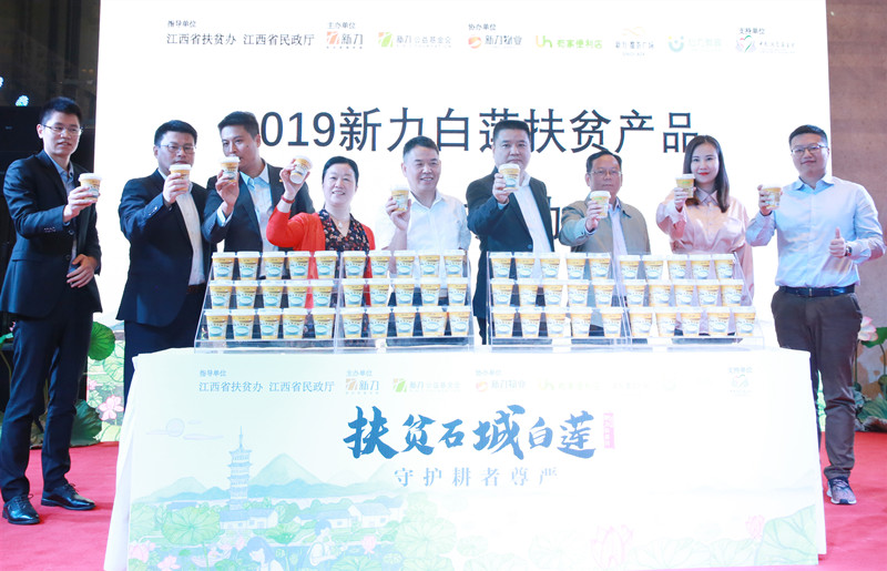 活动现场,江西省扶贫办、江西省社会组管理局、新力公益基金会、中国扶贫基金会、新力地产集团各产业代表共同揭幕,宣布新力白莲扶贫产品上市,“2019新力公益日”正式启动。
