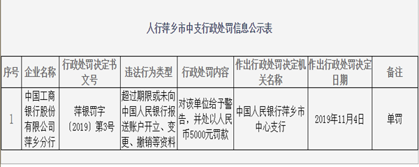 据公开信息显示,中国工商银行萍乡分行涉及的违法行为是:超过期限或未向中国人民银行报送账户开立、变更、撤销等资料,中国人民银行萍乡市中心支行对中国工商银行萍乡分行给予警告,并处以5000元罚款。