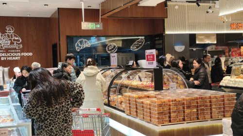 现场加工与餐饮化体验成为新亮点。调改后,店内烘焙与熟食的占比从原有的约5%增长至20%左右,现场制作档口大幅增加,除了原有的烘焙现烤区外,新增了现做的包子、鲜肉饼,以及烤鸡、现炸水饺等热门即食商品,烟火气满满。烘焙区新增了大量SKU,在延续网红品如山茶花山泉吐司、半斤榴莲肉榴莲千层、核桃满满的同时,亦结合冬季草莓季,推出了如“草莓奶油盒子蛋糕”等时令主题产品。