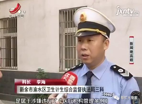 新余市渝水区卫生计生综合监督执法局三科科长李海: 她在这个场所里面,开展了诊疗活动,是属于涉嫌违反了《医疗机构管理条例》,未取得《医疗机构执业许可证》,开展诊疗活动。