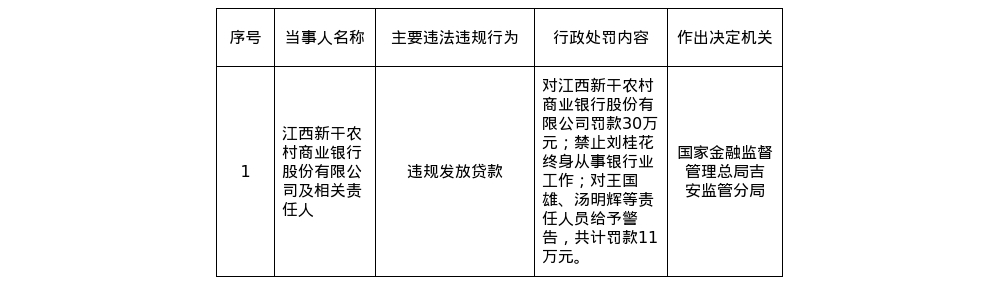 蓝鲸新闻1月22日讯,近日,国家金融监督管理总局吉安监管分局发布了一则行政处罚信息,剑指江西新干农村商业银行股份有限公司及相关责任人。