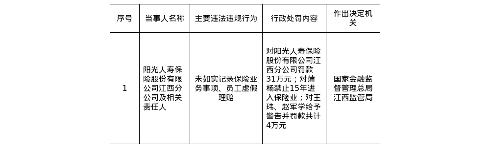 针对以上违法违规行为,国家金融监督管理总局江西监管分局对其处以罚款31万元;对相关责任人蒲杨禁止15年进入保险业,对王玮、赵军学给予警告并罚款共计4万元。
