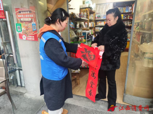 新春将至,为严守烟花爆竹禁燃禁放规定,守护辖区空气质量与居民安全,同时营造祥和喜庆的节日氛围,近日,景德镇市昌河街道景东安厦社区新时代文明实践站组织网格员、党员志愿者、纪检监督员走进辖区沿街商铺,开展禁燃禁放专项宣传,与商户签订倡议书,并送上新春对联、福字,以暖心服务筑牢安全防线,传递新春祝福,助力优化营商环境。