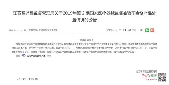 中国江西网/江西头条客户端讯 记者涂文华报道:近日,江西省药品监督管理局发布关于2019年第2期国家医疗器械监督抽验不合格产品处置情况的公告。南昌市德美康医疗器械有限公司、南昌贝欧特医疗科技股份有限公司榜上有名。