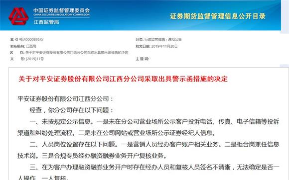 新京报讯(记者 张思源)据江西证监局近日官网披露信息显示,因涉未按规定公示信息、人员岗位设置存在问题、为客户办理融资融券业务开户时存在经办人员和复核人员签名不清晰、办公场所未经报备等原因,江西证监局向平安证券江西分公司下发警示函。