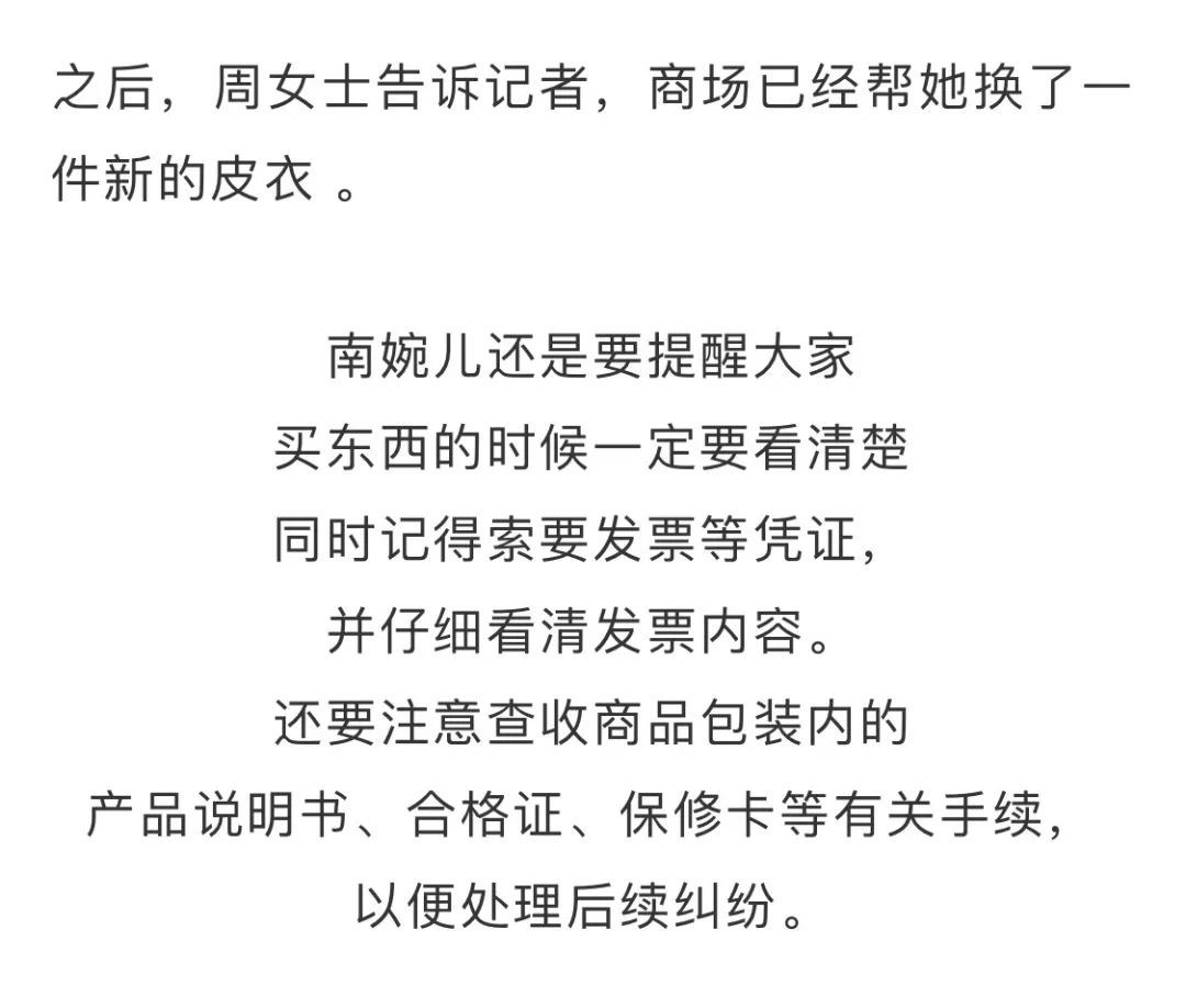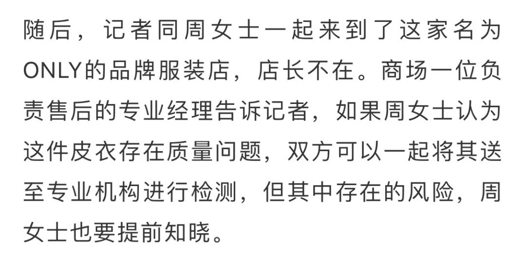 对于商场方面提出的方案,周女士表示不能接受,记者一番协调后,该专业经理表示,商场方面会想办法帮周女士更换一件新皮衣。
