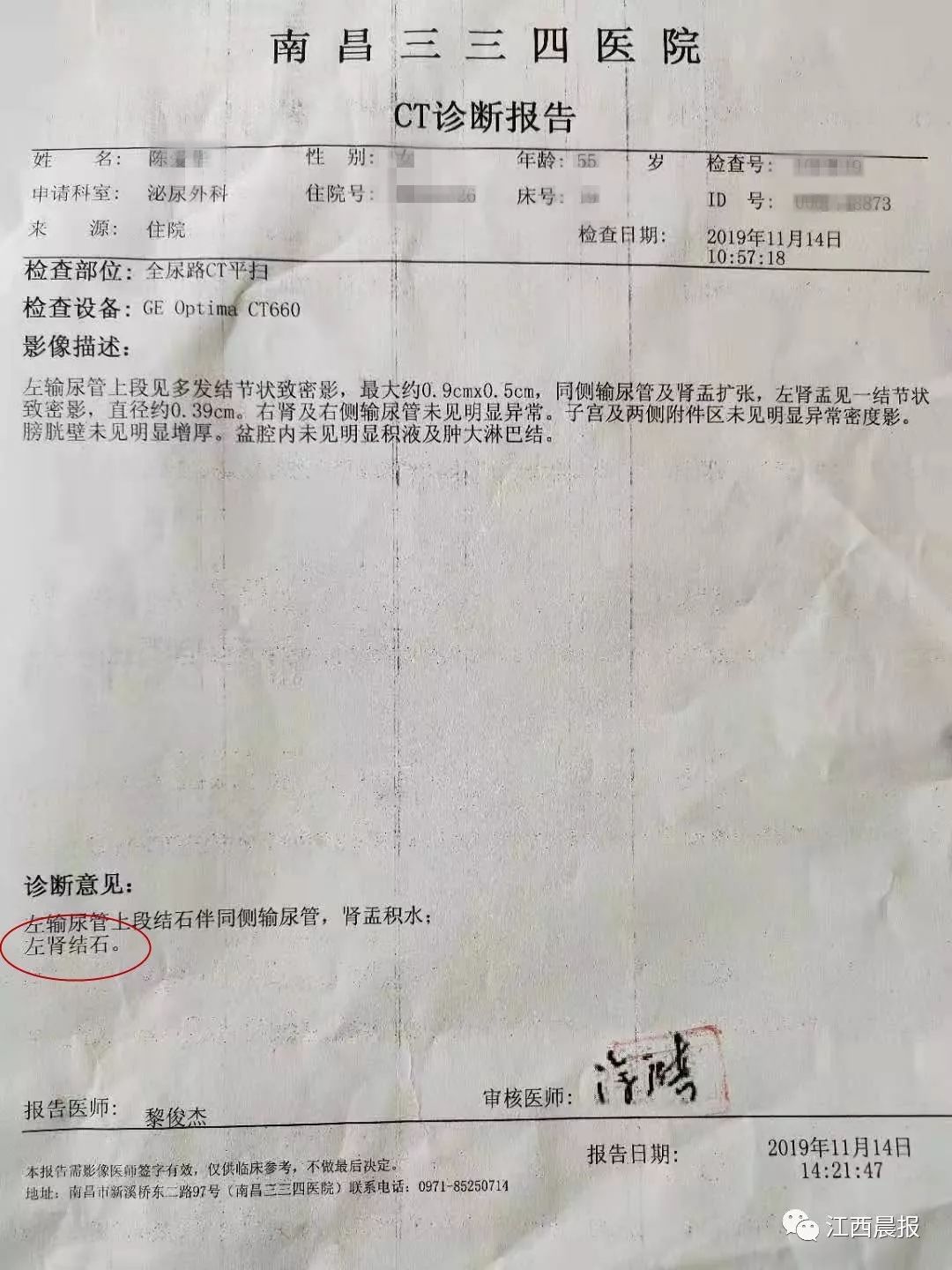 另一张11月14日的CT诊断报告则显示,张先生的母亲左肾仍有结石,且最大的达到0.9cm*0.5cm。