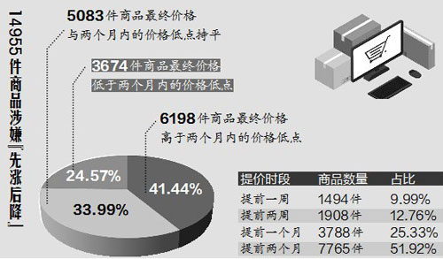 江南都市报讯 全媒体记者赵鸿宇报道:今年双十一,网购依然“套路”深。刚出炉的《江西省2019年双十一期间网购市场定向监测分析报告》显示,省市场监管局监测的涉嫌先涨后降行为的14955件商品中,有6198件商品最终价格高于两个月内的价格低点。
