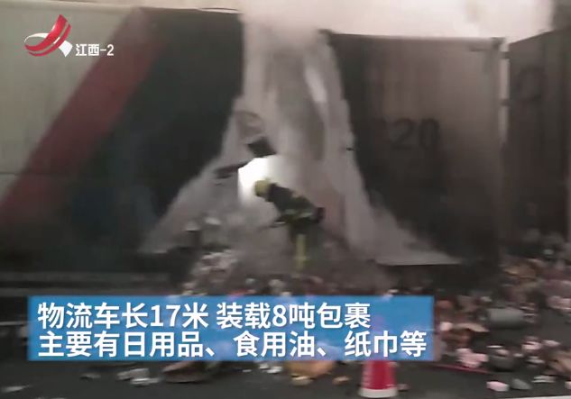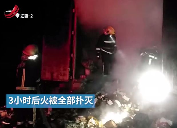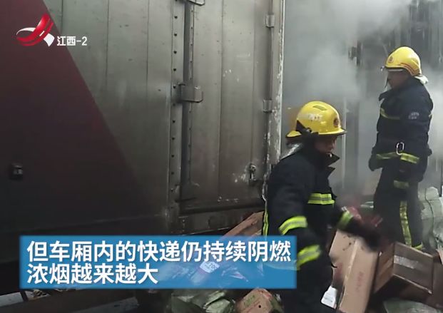 司机说,车上是从四川成都发往江西南昌的包裹,主要有日用品、百货、食用油、纸巾等。起火原因与后轮爆胎有关。