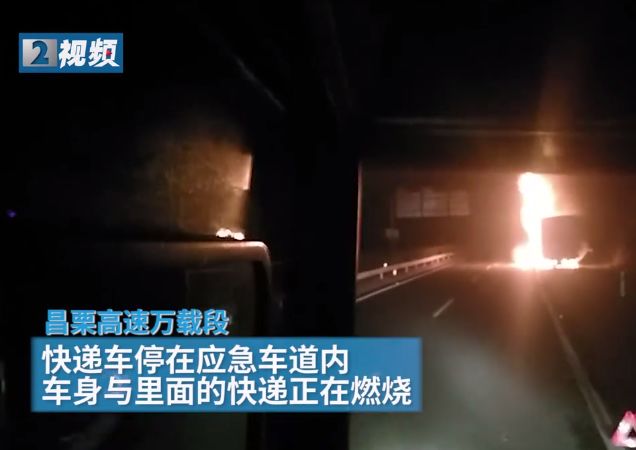 12月8日凌晨4点多钟, 在昌栗高速万载县境内, 一辆满载货物的快递车突然起火, 不少包裹遭殃。