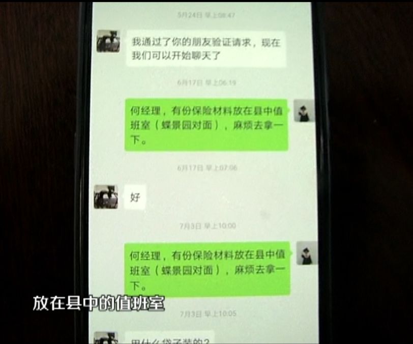 那么,问题究竟是不是出在了保险公司?小超的班主任陈老师出示一份微信聊天记录。 班主任陈老师: 这个是我们的龚主任,就是上一任,去年负责保险这边的。他在七月三日的时候给保险公司何经理发了信息的,他说这里有一份保险材料,放在值班室。就是蝶景园对面,麻烦你去拿一下。然后用什么袋子装的,他说没有袋子装的。