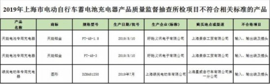 在电动自行车蓄电池充电器不合格项目上,两款天能电池专用充电器样品和一款绿亮电动车专用充电器样品不达标。