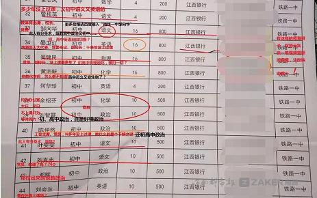记者发现,投诉材料共有11 页,分为" 南昌市学生课余教学辅导志愿服务中心分中心" 周末面授班课时津贴和网上答疑津贴两大部分,总金额超过15 万元,涉及100 多人。每个人的姓名、学科、课时、金额、银行卡号都一目了然。部分名单旁边用红色字进行备注。