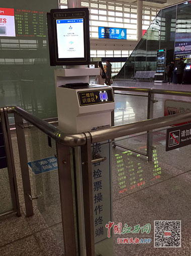 在南昌西站二楼检票口,不少旅客拿着手中的“小白条”准备乘车,工作人员耐心提示旅客,通过互联网购买车票的旅客还可以通过手机APP上的动态二维码扫码进站。目前,南昌西站的检票口已经安装全新的旅客检票操作终端,有二维码识读区。