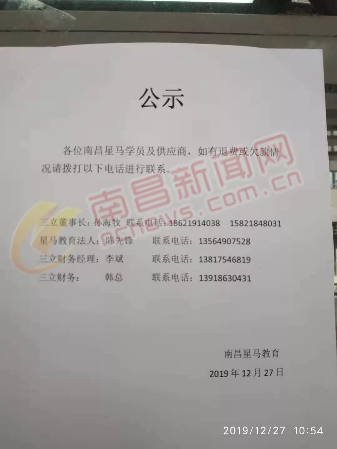 12月27日上午11时许,记者来到嘉弘商业广场商业街三楼的“南昌星马教育培训中心”,看到培训中心张贴了数张“公示”,内容为:各位学员和供应商,如有退费或欠款情况,请联系相关人员。