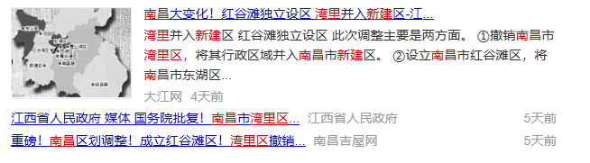 2019年12月25日,江西省人民政府发布关于调整南昌市部分行政区划的通知,文件显示:同意南昌市设立红谷滩区;同意撤销南昌市湾里区,将其行政区域并入南昌市新建区。将红谷滩新区单独设区,不但承认了新城的重要性,而且带动了新城的发展,有利于税收、服务等管理的明晰化。