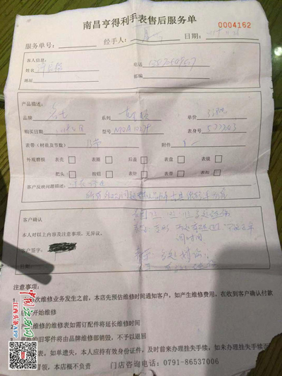 近日,南昌市胜利路亨得利名士手表销售店员告诉记者,许先生的手表是2019年12月16日送往第三方检测机构——上海历峰集团进行检测维修。“这是一个大公司,全国很多名钟表店都是到这个地方检测的。”上述店员如是说。