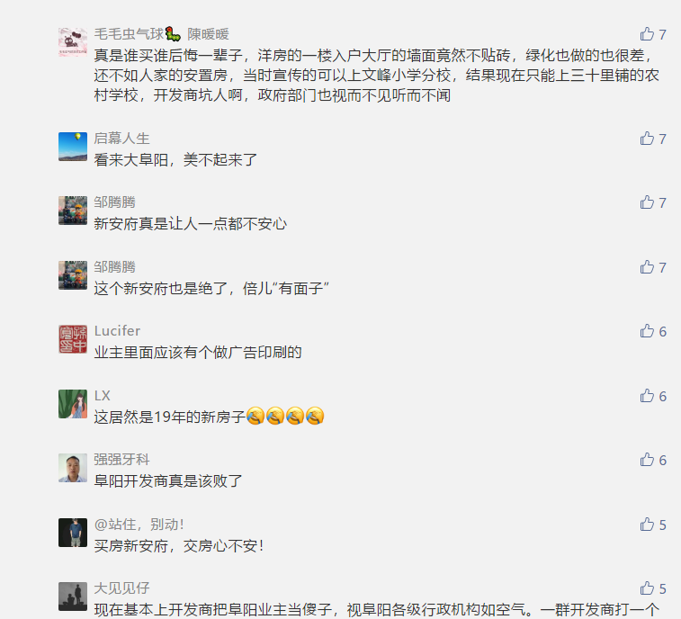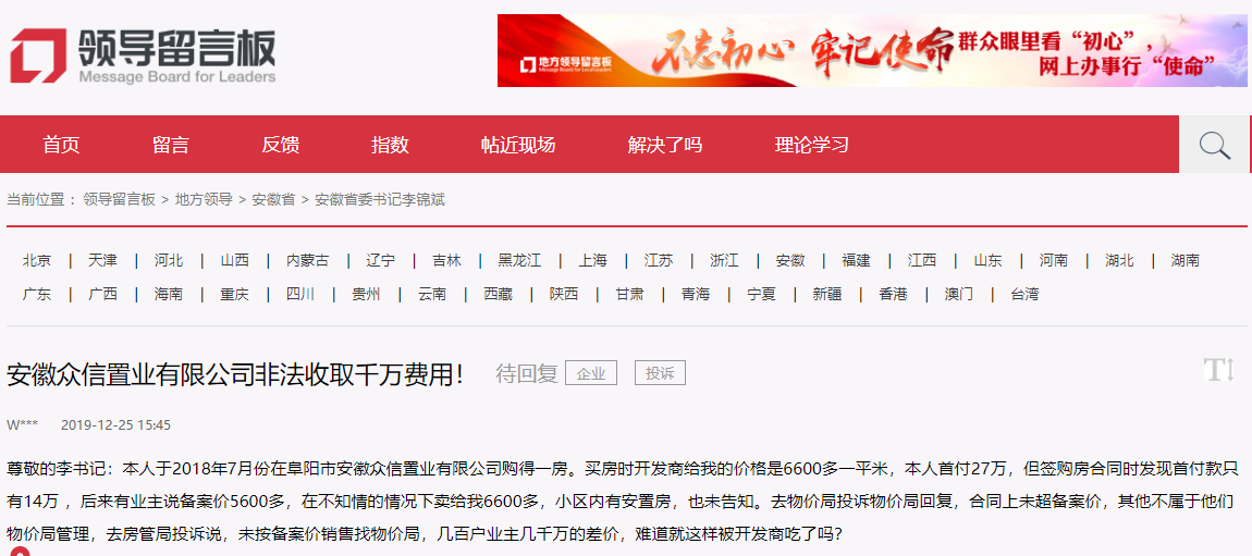 2019年12月25日,有网民在人民网领导留言板给安徽省委书记李锦斌留言:尊敬的李书记:本人于2018年7月份在阜阳市安徽众信置业有限公司购得一房。买房时开发商给我的价格是6600多一平米,本人首付27万,但签购房合同时发现首付款只有14万 ,后来有业主说备案价5600多,在不知情的情况下卖给我6600多,小区内有安置房,也未告知。去物价局投诉物价局回复,合同上未超备案价,其他不属于他们物价局管理,去房管局投诉说,未按备案价销售找物价局,几百户业主几千万的差价,难道就这样被开发商吃了吗?