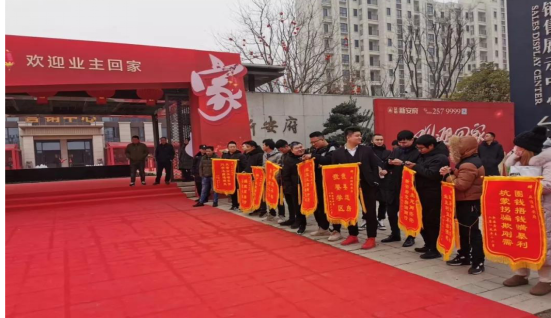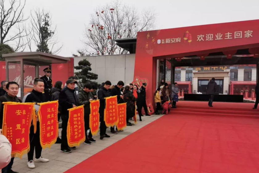 安徽众信新安府项目通知业主于2019年12月30日交房,当天众信新安府项目销售中心门前大红色的弓型彩门上写着:众信新安府欢迎业主回家。红色的地毯从广场一直铺到销售中心门前,地毯两旁的群众拿着红色的锦旗格外引人注目。