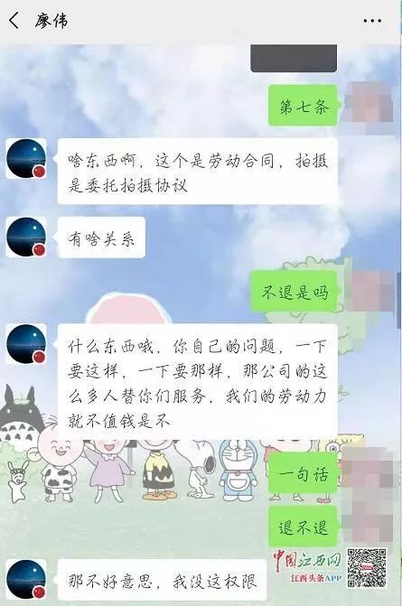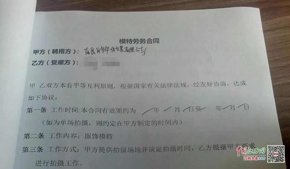 近日,中国江西网/江西头条客户端记者接到大学生小唐(应采访者要求化名)的投诉,称自己和多名朋友在南昌华字文化传媒有限公司应聘平面模特时,称需要上传照片到全国模特网后才可以安排工作。此外,公司还要求她们缴纳拍摄的费用1280元,并称后期会退还该费用。但此后要求退还费用时却被拒绝并被删除好友。