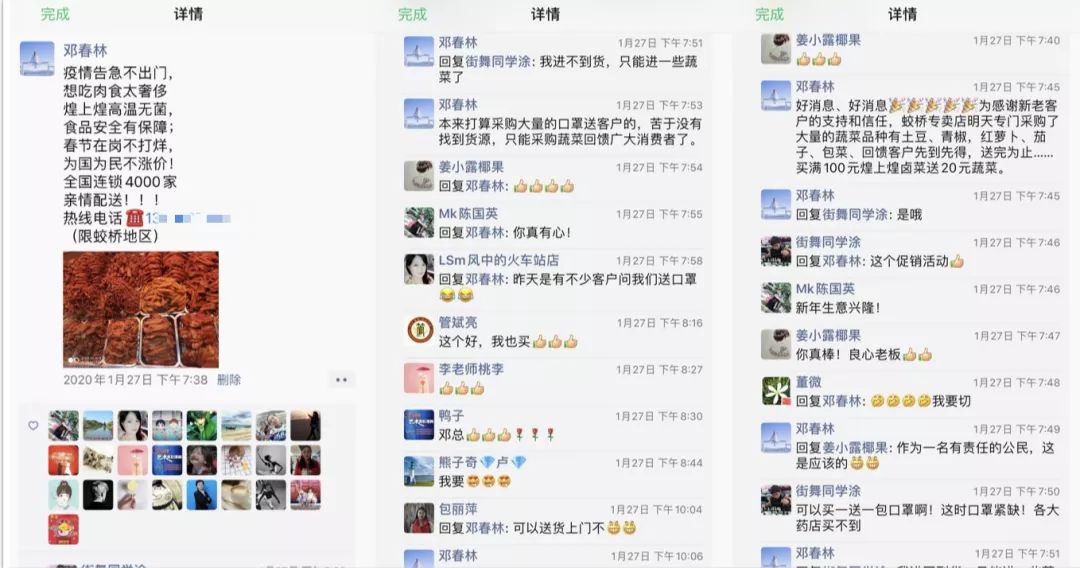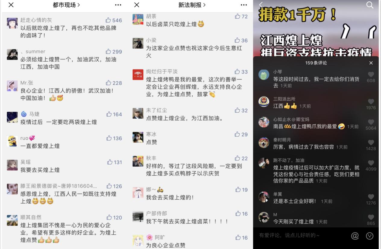 高温部何国华主动请战坚守,消毒杀菌、保障生产、打码贴标、准时发货,在疫情严重后,放弃与家人团聚,至今未休过一日;酱卤车间员工邹良主动承担各车间环境消毒工作,每日为各车间喷洒二氧化氯进行环境消毒,让每一位员工多了一份安心;动力部经理吴新亚从备战春节到疫情突发,为保障动力及设备的正常运转,他一直坚守岗位,已近5个月没有回去陪伴家人了……当街头的店面因疫情纷纷关闭时,煌上煌的大门依旧为消费者敞开;当这个城市渐入黑夜,煌上煌的灯光骤亮温暖人心。加盟商邓春林,走村串户采购水果蔬菜,让消费者在门店完成一站式购买,他在朋友圈写到:“疫情告急不出门,卤菜安全有保障,春节在岗不打烊,为国为民不涨价”,引来无数点赞;