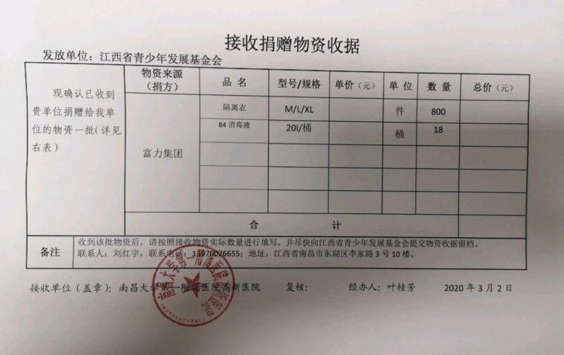 在接到富力集团的捐赠之后,江西青基会根据省内各市(地)疫情防控形势、疫情医用防控物资需求情况,采购医院紧缺的医用隔离服及84除菌液,捐赠至疫情严重地区新冠肺炎定点救治医院。其中: