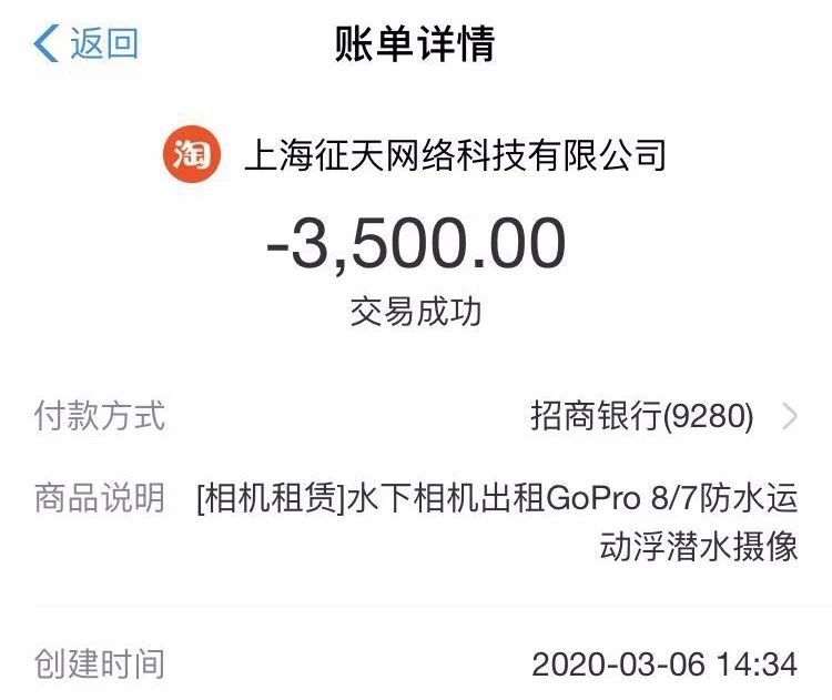 与此同时,张小姐的支付宝账户就被“上海征天网络科技有限公司”扣去3500元,商品说明的内容跟她遗失的相机有关。