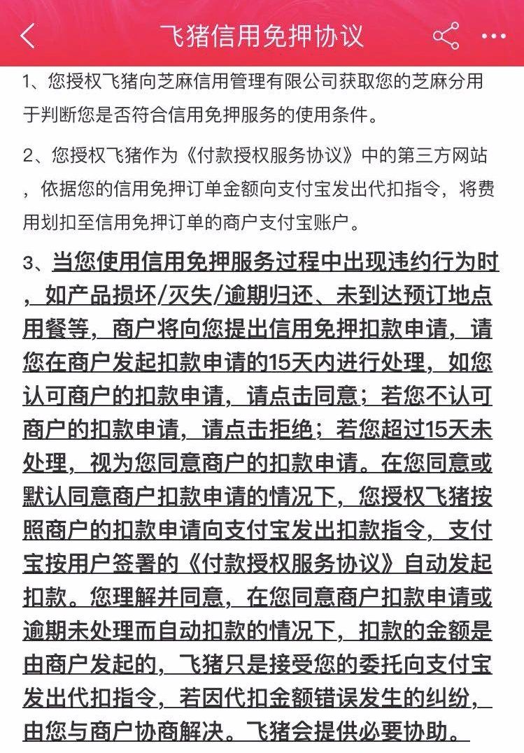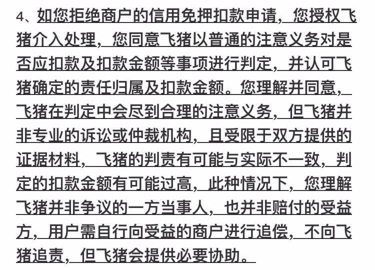 然而“飞猪信用免押协议”的第4条称,如您(用户)拒绝商户的信用免押扣款申请,您授权飞猪介入处理,您同意飞猪以普通的注意义务对是否应扣款及扣款金额等事项进行判定,并认可飞猪确定的责任归属及扣款金额“。