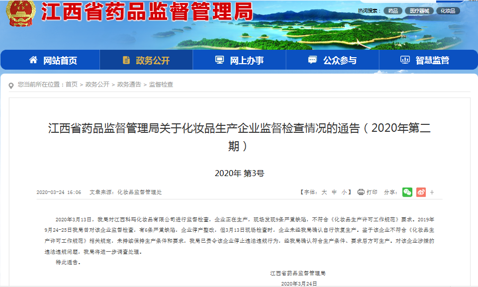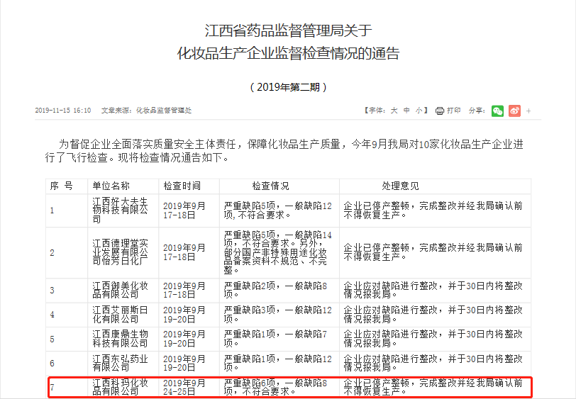 2019年11月15日,江西省药品监督管理局《关于化妆品生产企业监督检查情况的通告》中显示,在去年9月的飞行检查中,发现江西科玛化妆品有限公司严重缺陷6项,一般缺陷8项,责令该企业停产整顿,完成整改后未经允许不得恢复生产。
