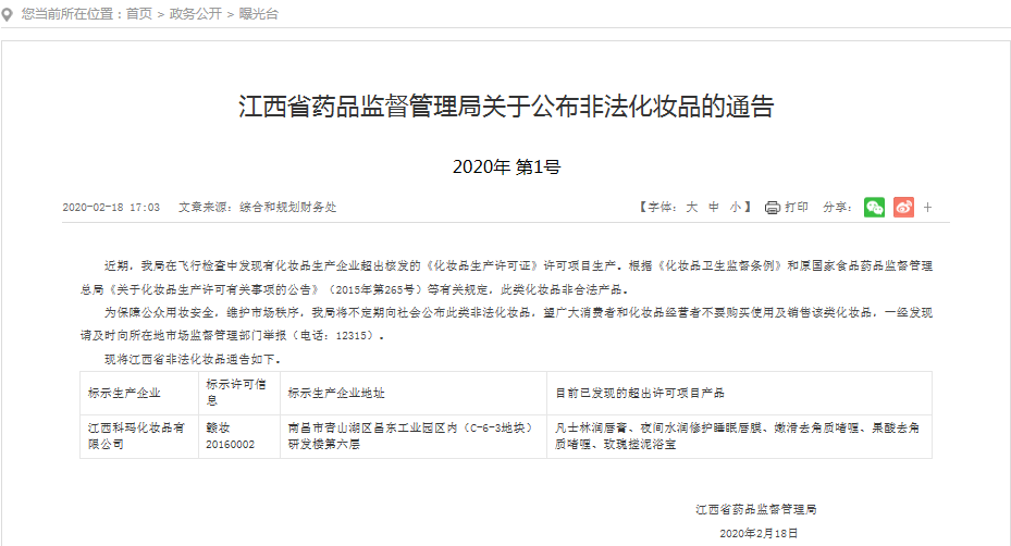 2月18日,江西省药品监督管理局又发布了《关于公布非法化妆品的通告》,通告显示在飞行检查中发现江西科玛化妆品有限公司超出核发的《化妆品生产许可证》许可项目生产,由该企业生产的凡士林润唇膏、夜间水润修护睡眠唇膜、嫩滑去角质啫喱、果酸去角质啫喱、玫瑰搓泥浴宝均为非合法产品。