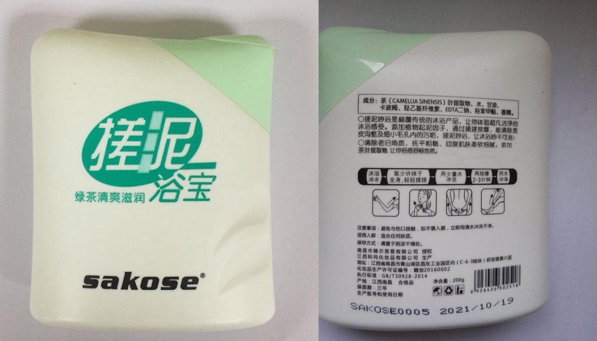 图为江西科玛化妆品有限公司生产的Sakose绿茶清爽滋润搓泥浴宝(备案已注销)