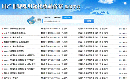 据了解,江西科玛化妆品有限公司曾自主生产sakose、雪玲妃等品牌产品100多种,但近几年来均已注销备案。