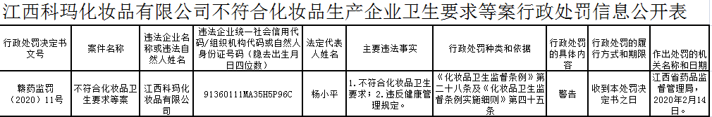 2月24日,江西科玛化妆品有限公司再次因不符合化妆品卫生要求、违反健康管理规定,不符合《化妆品卫生监督条例》和《化妆品卫生监督条例实施细则》,被江西省药品监督管理局采取警告行政惩罚措施。
